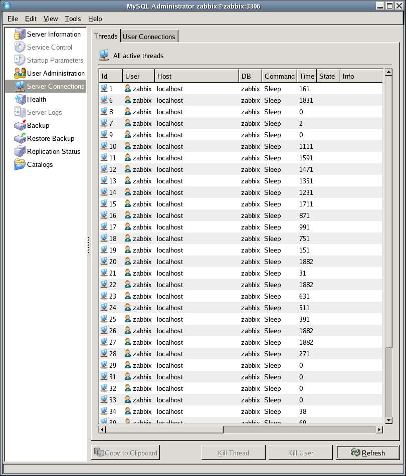 I did a fresh install of 1.1 and so far everything is going good. But once I started adding a large number of items (7000+) the queue started backing up. We have tweaked the database and have increased both the trappers and suckers to 50. This help alittle, but we noticed that most of the conncetions to the database are sitting idle and never being used. Is there a way to get the idle connections to start doing something? The server is sitting idle most of the time and barley being touched by zabbix or mysql.