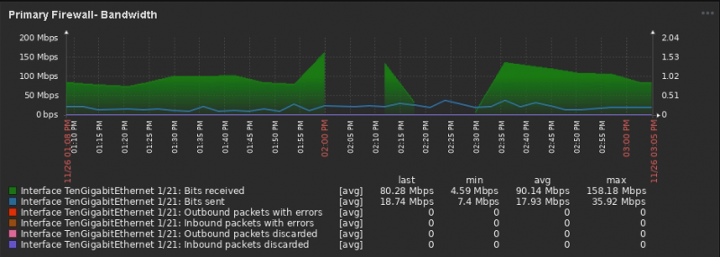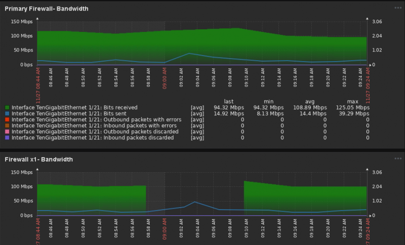 I have two graphs capturing ingress/egress from our firewall. The top graph (capture.png) is capturing this data from the switch port (that the firewall connects to) on our core switch, and the bottom graph is capturing this data directly from the firewall.