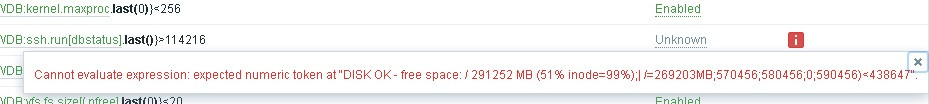 But than I do expression smth (\d{2,3}%\s{IW_oracle:ssh.run[dbstatus].last()})<20% New Trigger say "Error" and didnt save.