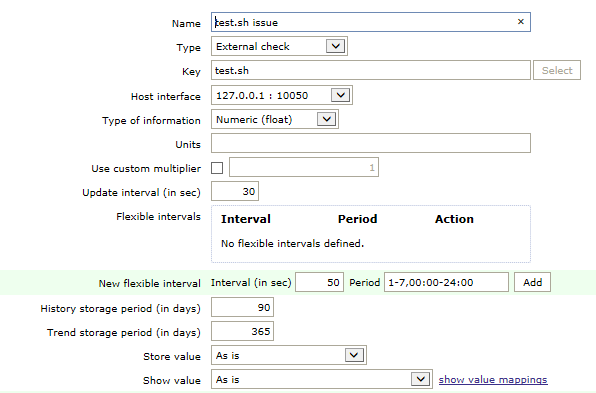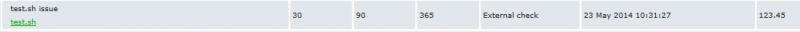 Finally, I configured an External check item in Zabbix which key is test.sh[]