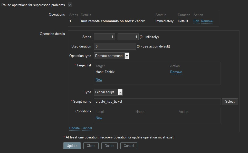 Interestingly when I look at the dashboard and click the host that is in alarm, I can manually execute "create_itop_ticket" script and it will resolve the Host Name from the Macro, but not the Event Name or the Event ID (I have been playing around with which of the parameters I want to use and have settled on these.