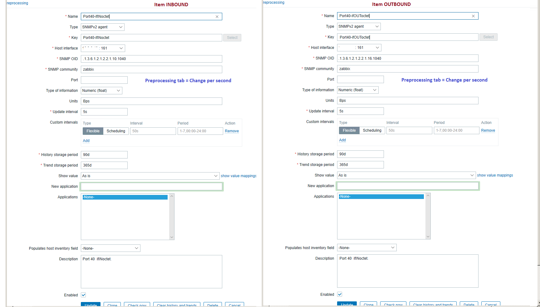 2) Create the snmp item for the outgoing traffic (1.3.6.1.2.1.2.2.1.16.40):