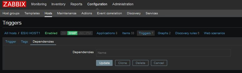 Having gone to configuration > hosts >host A > triggers > dependencies