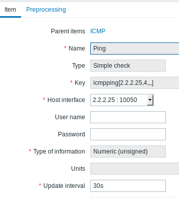 I have created a simple check item to test ICMP against a host. Interval set to 30s. It is working properly.