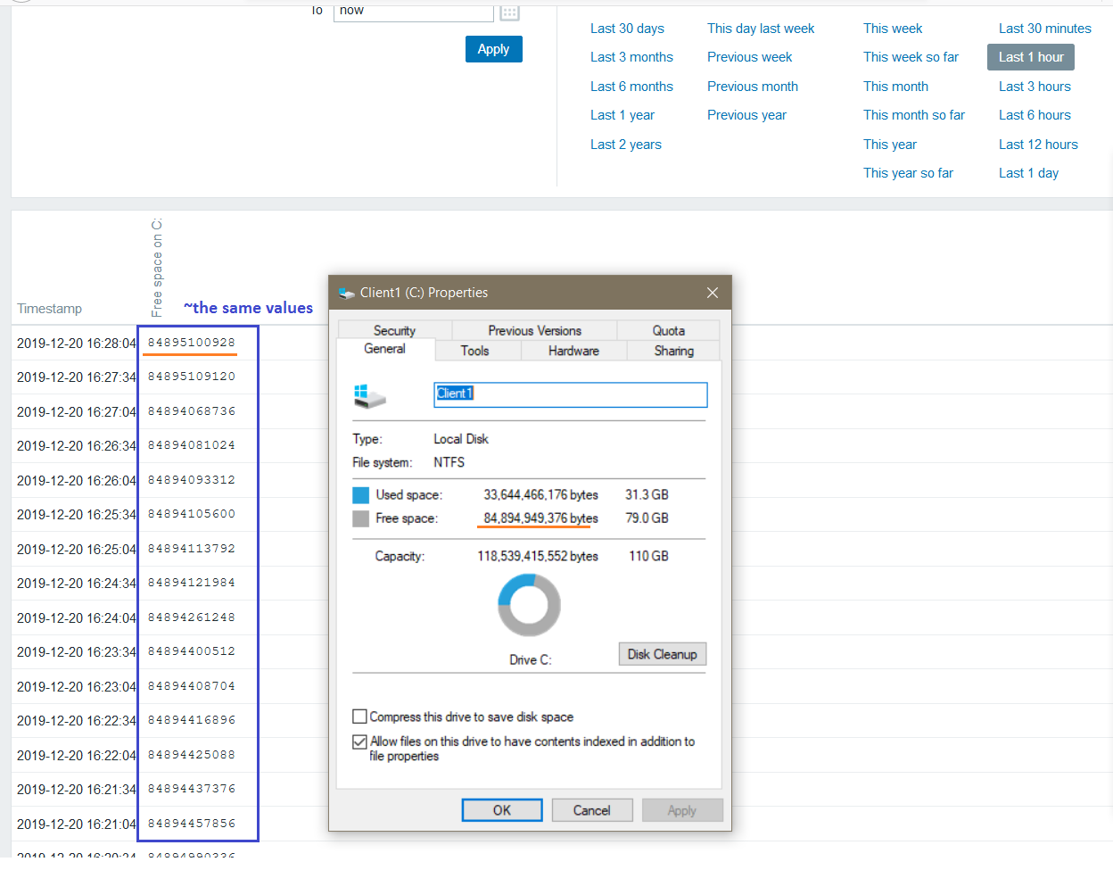 Q2: Is it normal to display the free space as 84GB when the real value is 79GB (I haven't supplied any letter (Gb, Kb,... in the Units field of the item)?