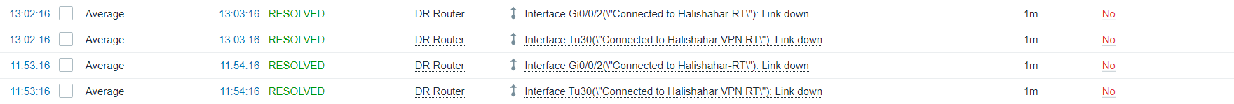 For last few months I am getting a great unusual problem in my environment. I have some cisco switches and routers and I monitor the Operational Status of the interfaces, tunnels. It should trigger whenever any interface gets down and show resolved if the interface is up. Previously this was working fine. But recently I am getting the trigger whenever the problem occurs but it shows resolved by 1 minute. But actually the interface is not up. I am using Template Net Cisco IOS SNMPv2 with following expressions: