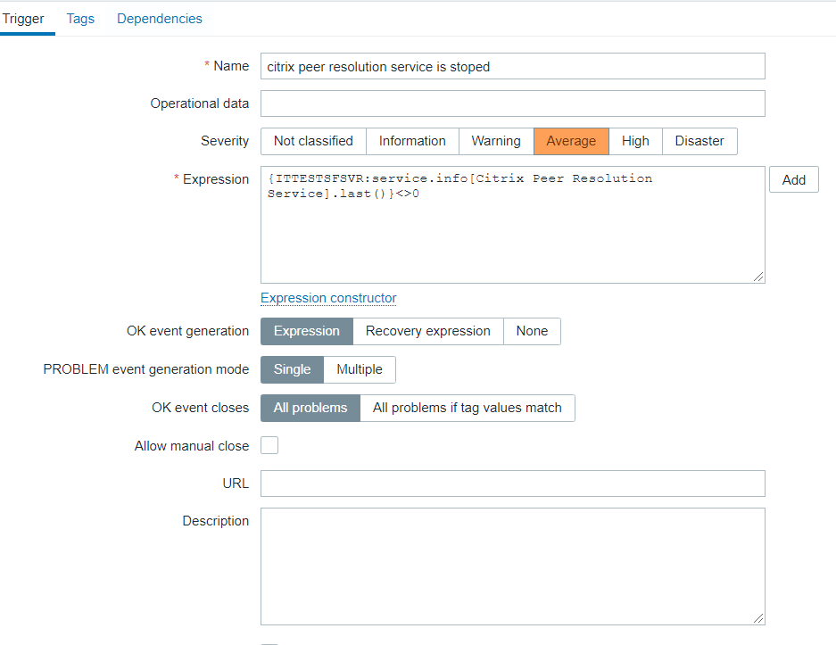 When the service has been stoped, the Dashboard of zabbix show the alarm.