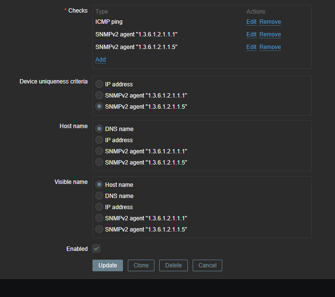 Discovery check equals Automatic discovery of network devices: SNMPv2 agent (161-162) "1.3.6.1.2.1.1.1"