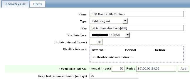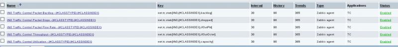 Then I setup a LLD rule using the net.tc.class.discovery[tc_device] key,Code:### Option: UserParameter: TC discovery UserParameter=net.tc.class.discovery[*],/config/scripts/tc_class_discovery.pl $1 ### Option: UserParameter: TC Stats UserParameter=net.tc.stats[*],/config/scripts/tc_stats.pl $1 $2 $3