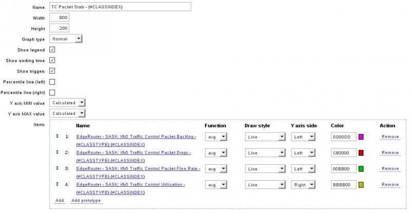 Then a second script to populate the discovered class items, the arguments on this one are the device, the tc class index, and the item:Code:#! /usr/bin/perl $first = 1; $ind = 0; print "{\n"; print "\t\"data\":[\n\n"; my @data = qx/\/sbin\/tc class show dev $ARGV[0]/; foreach (@data) { ($index) = (@data[$ind] =~ /class\s\S+\s(\S+)\s.+/); ($type) = (@data[$ind] =~ /class\s(\S+)\s\S+\s.+/); print " ,\n" if not $first; $first = 0; print "\t{ "; print " \"{#CLASSINDEX}\":\"$index\","; print " \"{#CLASSTYPE}\":\"$type\""; print "\t}"; $ind = $ind+1; } print "\n\t]\n"; print "}\n";
