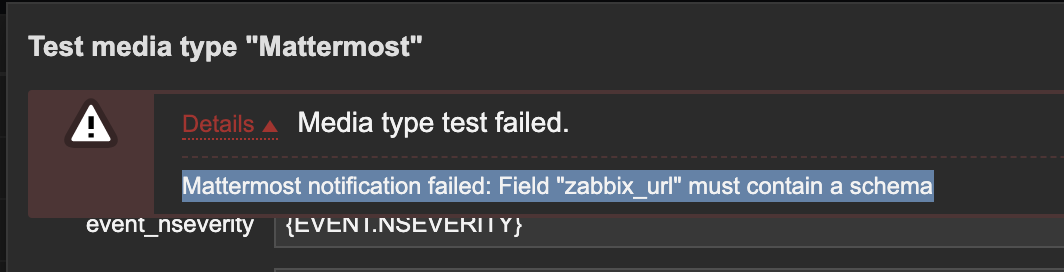 We have set up the Mattermost web-hook, and the Macro according to THIS set of directions but when we test from Zabbix tMedia types this is the error we get: