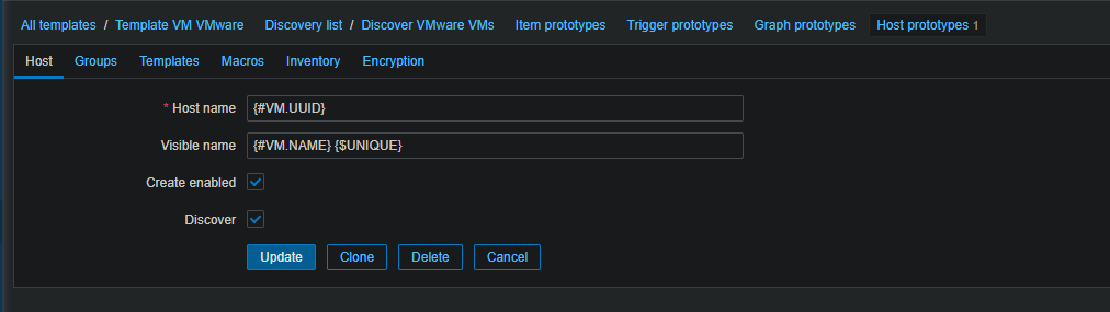 I'm monitoring some locations with zabbix proxies.My first priority is to watch virtual machines.To do that I'm using the default Vmware template.However,If there are 2 hosts,or hypervisors with the same name I can not add them.To prevent that I wanted to give a macro to host prototypes,so that different machines with the same name can have their unique names.However once hosts are discovered Hosts names are like this :