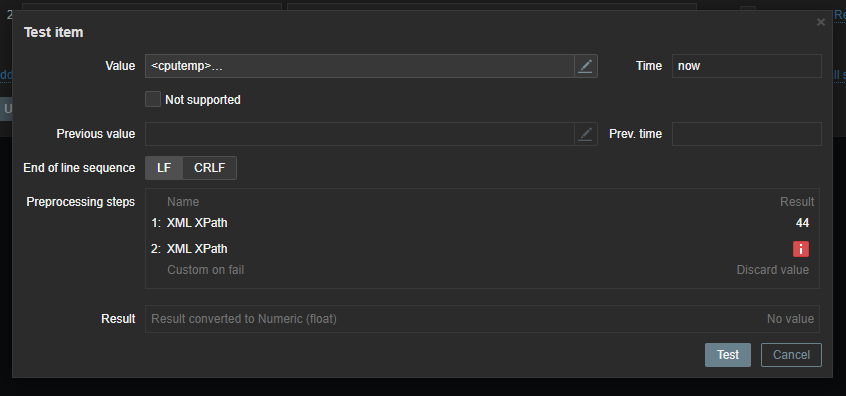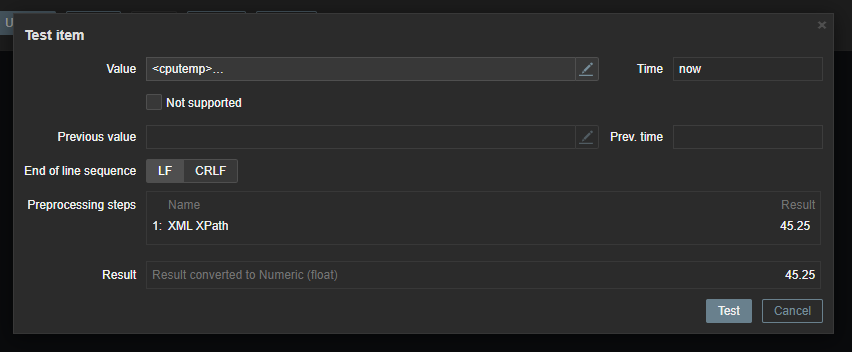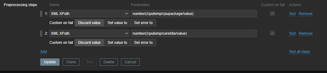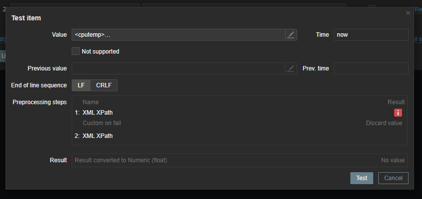 I've created a template that executes a PowerShell script via the agent and retrieves the current CPU temperatures as XML data. This works fines from the script perspective but I'm having issues with getting the value back when the location in the XML can be different depending on the make of CPU - I've only seen two different ones so far.