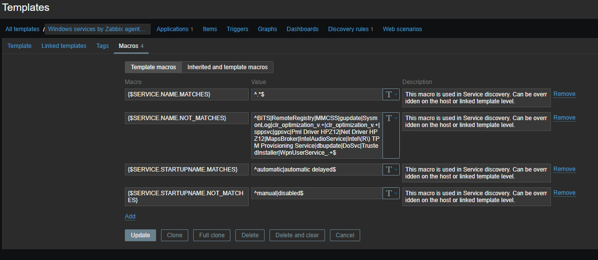 I have several server and most of them trigger the "Windows Update" and "Smartcard" and some other not-running-alert. I have read that I need to insert an exception into "Configuration/Templates/Windows services by Zabbix agent/Discovery Rules/Windows services discovery/Filters" like this: