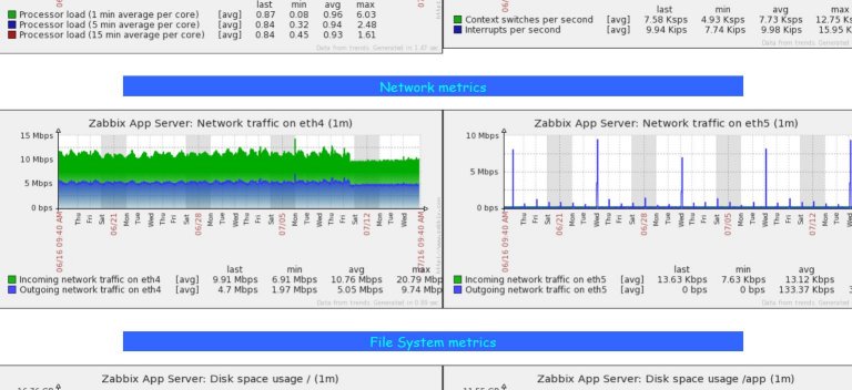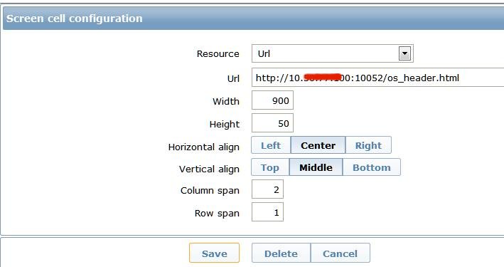 To achieve this I configure the screen cell as shown below. The final layout is shown is the screenshot of the screen at the bottom. I create the HTML files and place them in my /var/www/html/zabbix directory and give them the correct permissions for all users to read.
