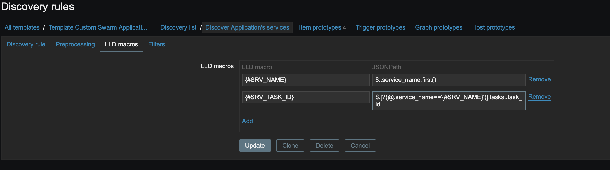 I've created a python script and LLD template. The script runs on docker swarm node and generates next json structure