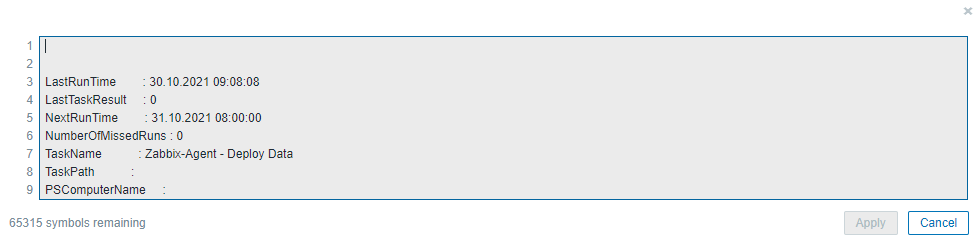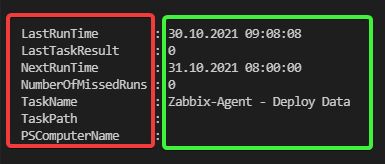 Powershell -NoProfile -ExecutionPolicy bypass -Command "Get-ScheduledTaskInfo -TaskName 'Zabbix-Agent - Deploy Data'"