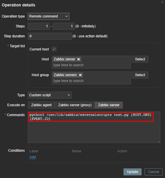 /usr/lib/zabbix/externalscripts/ssh.py --ip {HOST.DNS} --idm {EVENT.ID}
