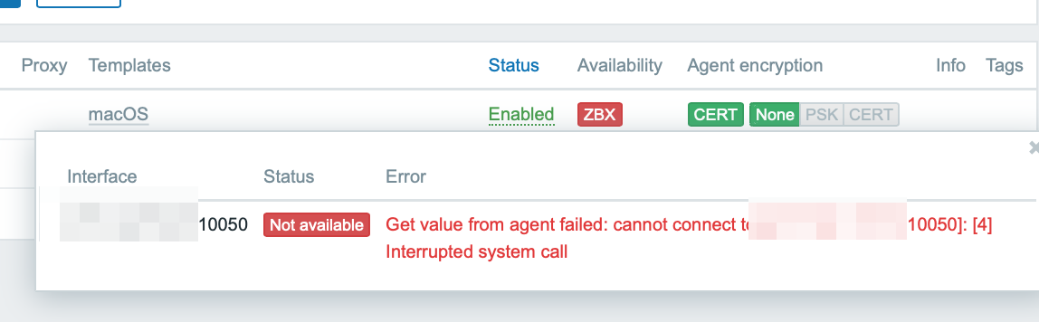 Get value from agent failed: cannot connect to [[ip address]:10050]: [4] Interrupted system call