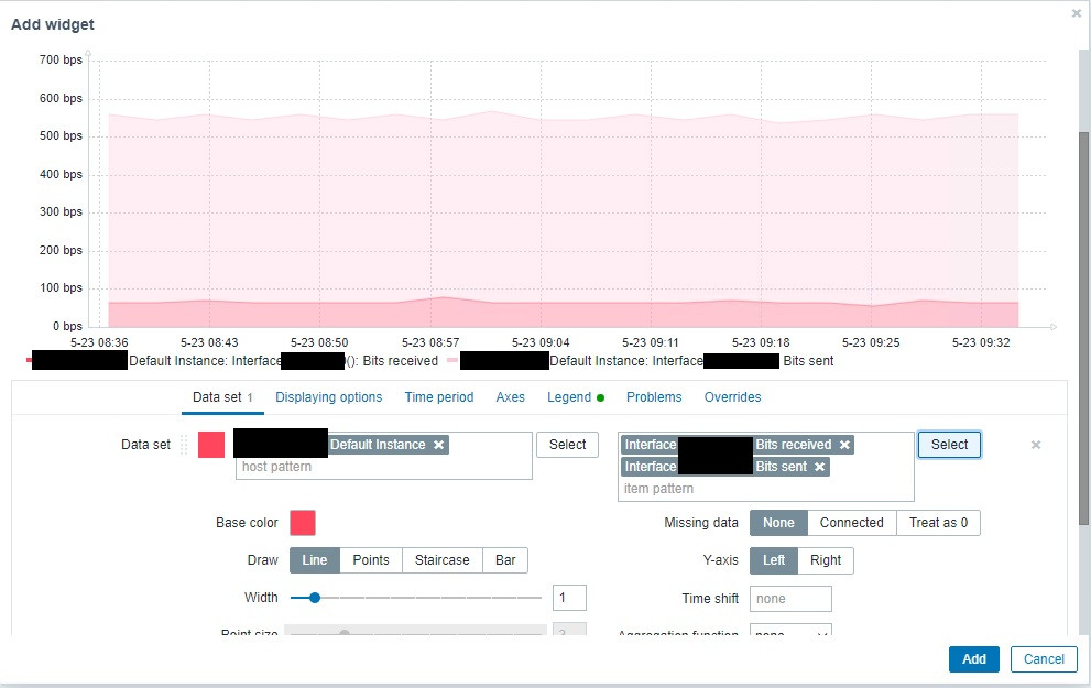 Then (scroll down to "Data set 1") I chose the switch in "host pattern" and a few useful items in "item pattern" (bits sent, bits received, error packets in and out, and discards in and out) for a single interface.