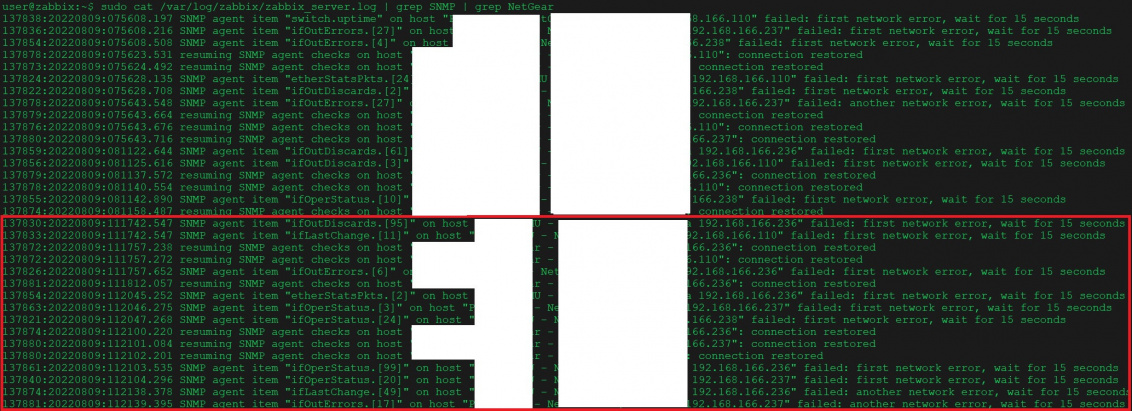 SNMP agent item "used.hdd" on host "HOST A" failed: first network error, wait for 15 seconds resuming SNMP agent checks on host "HOST A": connection restored SNMP agent item "ros.time" on host "HOST B" failed: first network error, wait for 15 seconds resuming SNMP agent checks on host "HOST B": connection restored