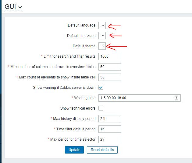Administration > General > GUI > Default language or Default theme or Default time zone