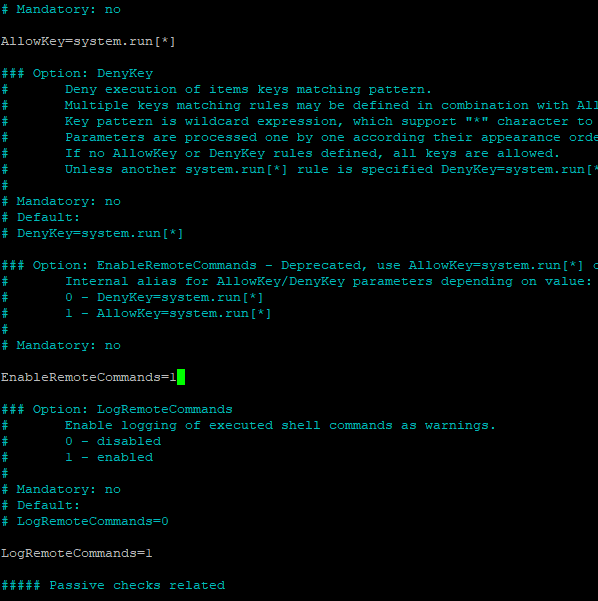 /etc/zabbix/zabbix_agentd.conf with AllowKey=system.run[*]. I also added EnableRemoteCommands=1andLogRemoteCommands = 1.