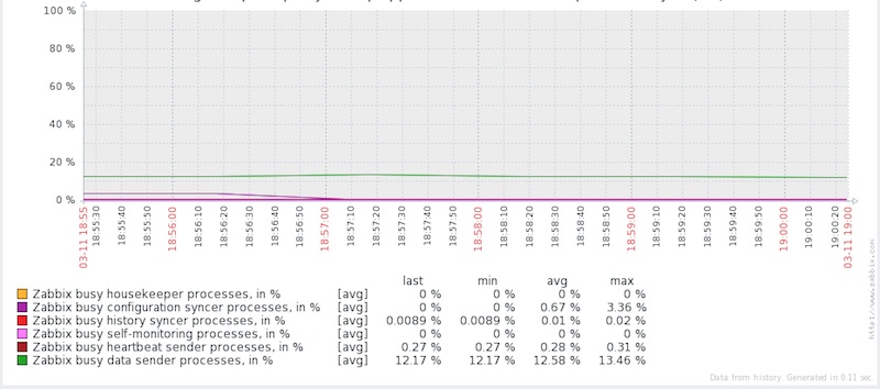 Caches are near empty, processes are pretty idle and things look good but that proxy_history table is all over the place.
