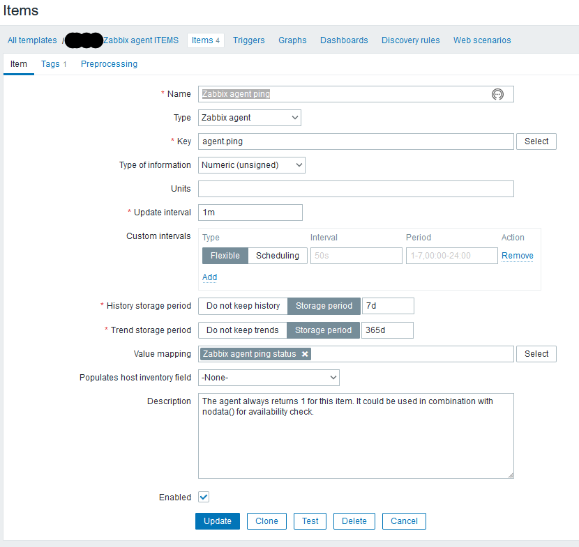 - Screenshot 1 shows the template that contains just 4 ITEMS. The agent.ping item is open.