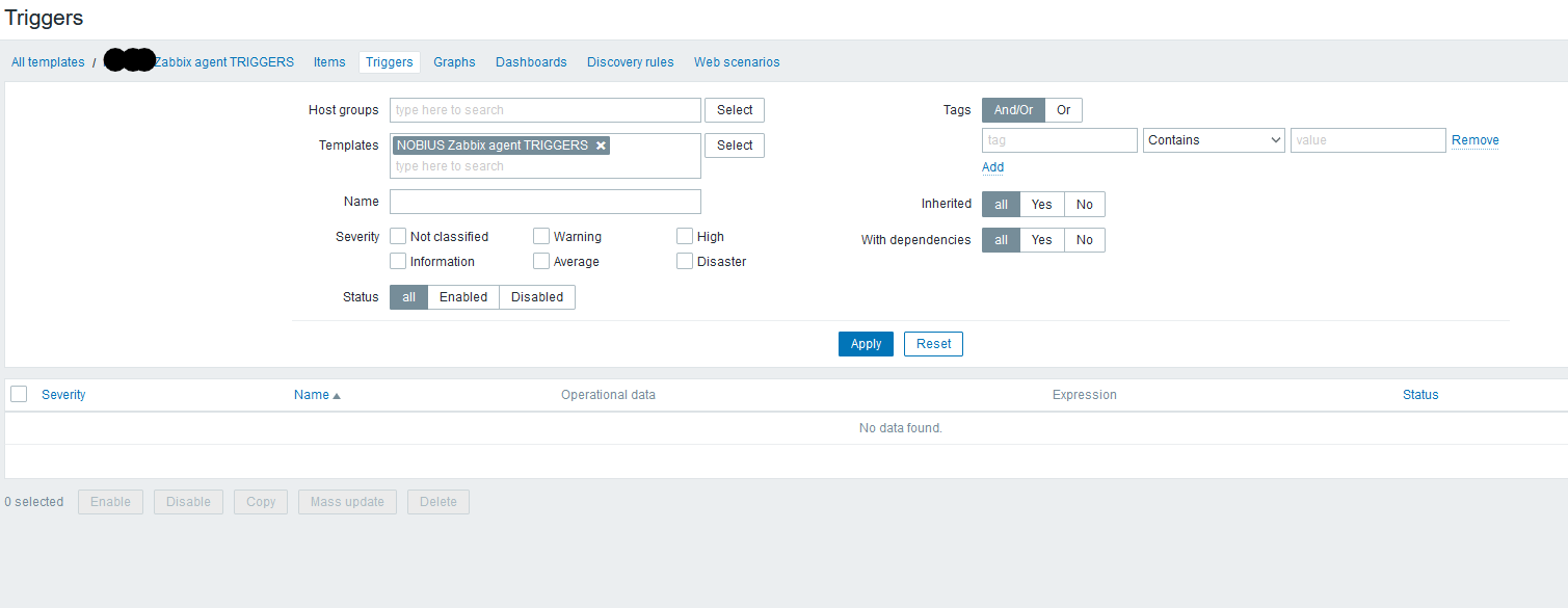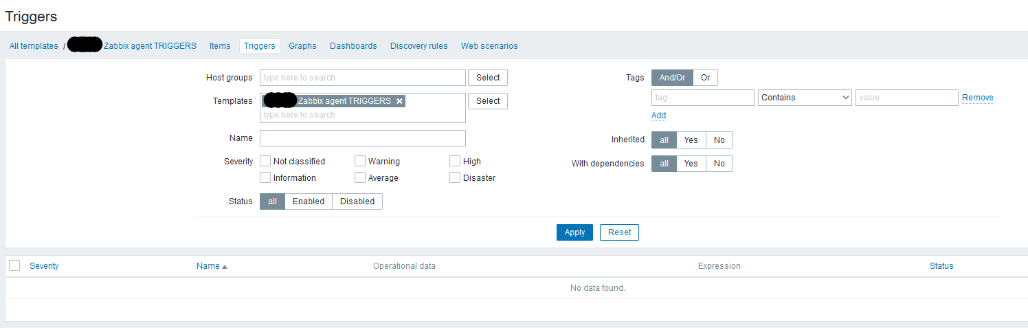 - Screenshot 2 shows the template that will contain just a single TRIGGER - no items. No triggers are currently defined.