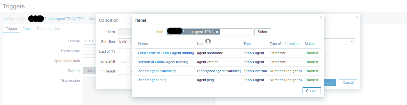 - Screenshot 3 show the start of creating a TRIGGER in the Zabbix agent TRIGGERS template. The condition is set to be the ITEM from the Zabbix agent ITEMS template as you can see.