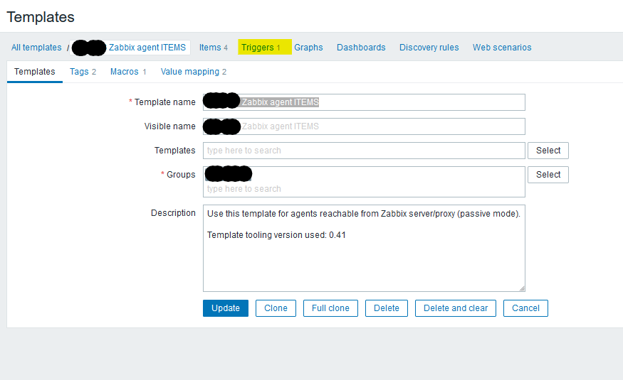I then have a second template that contains only TRIGGERS - again for simplicity let's say a trigger to send an alert if the agent.ping the first (Items) template fails.