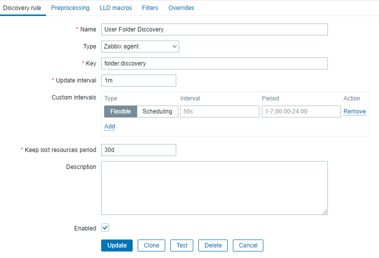 UserParameter=folder.discovery,powershell -File "C:\zabbix\scripts\FolderSize.ps1"