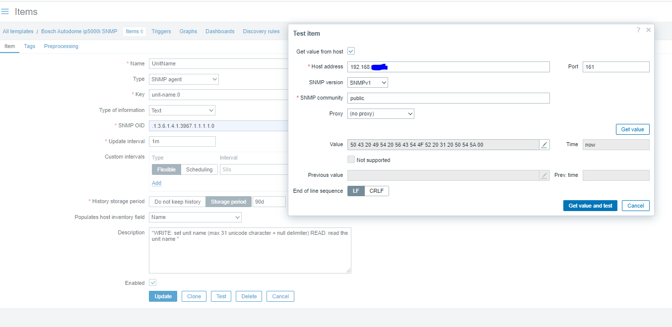 Zabbix ver.6.4 Creating a new template for camera Bosch Autodome ip5000i. Faced with issue. Making SNMP request using MIB browser to get the unit-name, receiving the correct answer (PC IT VCTOR 1 PTZ), all is good. When i added this information( SNMP OID, Key ) to the new template and pressed Test button, I received incorrect answer in a very strange format (50 43 20 49 54 20 56 43 54 4F 52 20 31 20 50 54 5A 00 ). Others OIDs works correct, the problem only with this OID. Who had the same issue, how to solve it? Type of information tested as Text, as Numeric etc... The answer is the same.