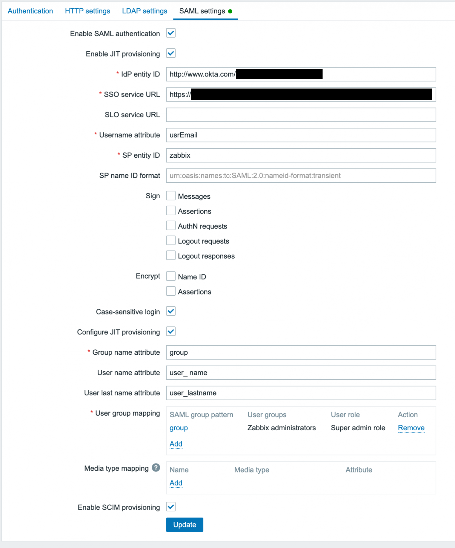 I've already set up our SSO_SETTINGS to include these variables: "{'strict':false, 'baseurl':'https://<zabbix_url>/', 'use_proxy_headers':true}"