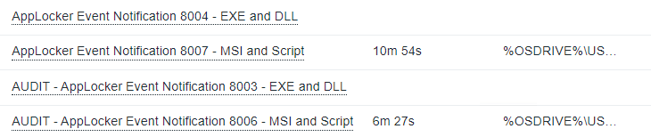 If I create a generic item to capture everything in the WEC-AppLocker log (eventlog[WEC-AppLocker,,,,,,skip]), they don't come in either, but events 8006 and 8007 still do.​