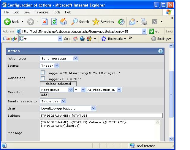 ACTION A) I have One action requiring ONE condition to email me as zabbix admin on ANY Severity=high
