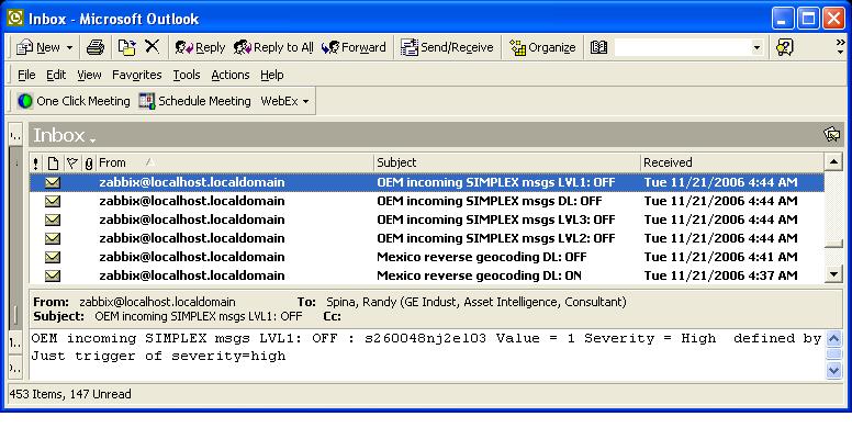 But myself as Admin why would I still get the OFF Actions. (I know its from the severity=high ONLY action because I hard text into the email the email says "from severity is high" only. Aren't the conditions additive. I would have thought that I would NOT get the OFF emails either. Here is a picture of the action definition and my email as zabbix admin..