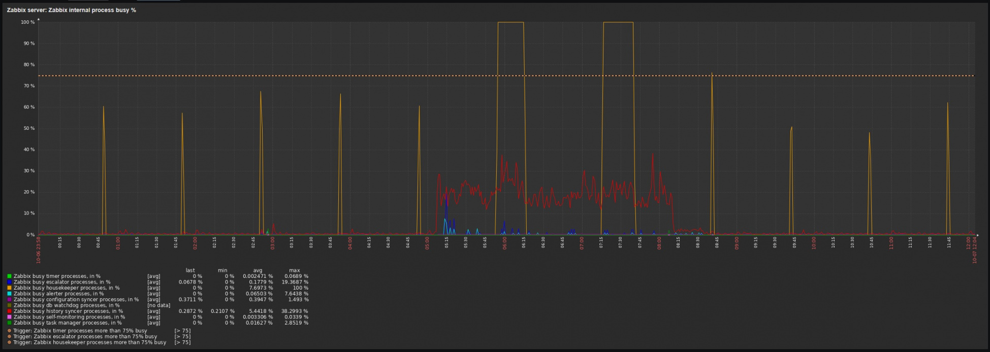 In the process graphics is visible that the history syncer percentage (red line) is highly increasing at 5am. Thereby the housekeeping process also increases his percentage when started.