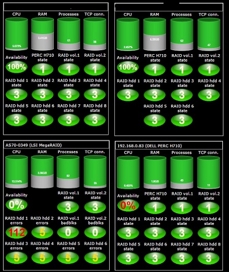 Our company now migrates the monitoring system from Hyperic HQ to Zabbix. Hyperic offers the plugin known as Wall Mount Visualizer. It allows to construct full screen schemas using the graphic primitives for visualizing the selected metrics of multiple hosts that are under supervising. The example of monitoring screen is attached below (original size of that fragment is about 600x700 pixels, so it is able to show up to 36 hosts with the same metrics set on the FHD-resolution screen) .
