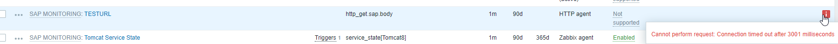 When checking the items on host, i get error saying: Cannot perform request: Connection timed out after 3001 milliseconds