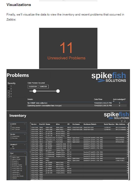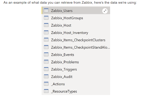 I had a question to ask you. I've been following the implementation guide from Zabbix to Power BI (https://www.spikefishsolutions.com/p...ktop-to-zabbix), everything is correct. The issue is that they only provide two commands, for host.get and user.get. I would like to implement the remaining functionalities of Zabbix in Power BI to create a beautiful and concise dashboard where I can monitor ping issues, device downtimes, etc. In the blog, I've seen that they manage to visualize it, but they implement more complex queries with commands that I'm not familiar with. I've attached a photo. If anyone knows how to achieve this or has the commands, I would appreciate it. I've been searching online and with the help of ChatGPT, I've only managed to extract 4 more commands.