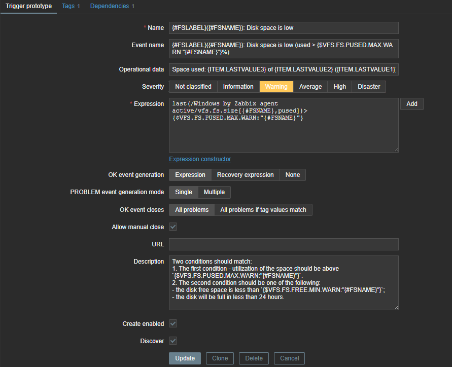 Any idea how I could also add information regarding free GBs on the disk in email notification? But like I said, I'm using only one trigger action for notifications that is based on entire template, so I think I should add some parameters to template triggers. Hopefully someone can point me in the right direction.