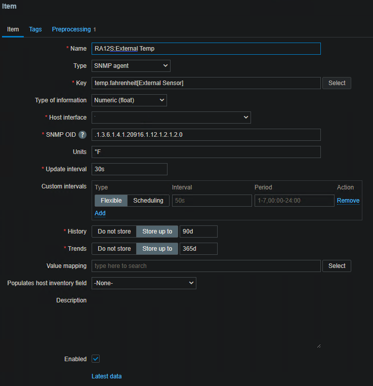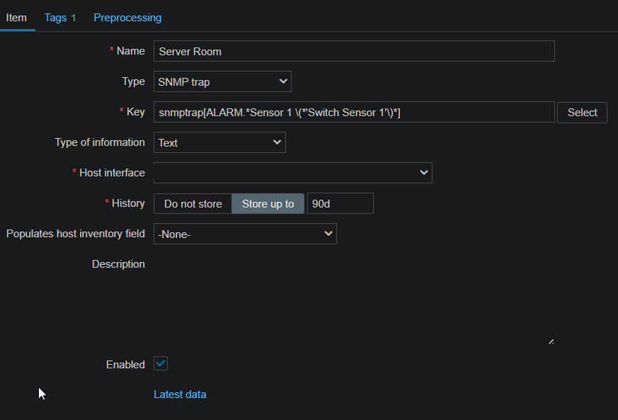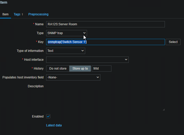 I setup the item in the room alert 12s host as snmptrap it doesn't log any history. See screenshot. I've tried so many different variations for the regex, none of it works. Our old Room Alert 3E devices have a similar snmptrap setup that works. I've confirmed the sensor names are correct in the Room Alert web interface. I tried to look for any templates and I've not found any. The only difference I've noticed is the Room Alert 3E is using a template.