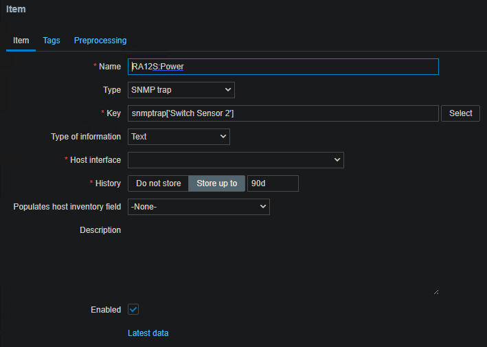 I've been at this for a few hours, and I can't figure out why the snmptrap item I created isn't capturing any information from our Room Alert 12s & 3s sensors is not being logged. The snmptrap.fallback is logging the following history from the sensors:
