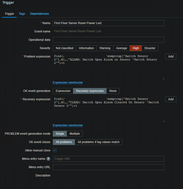 Recovery expression: find(/nameofhost/snmptrap['Switch Sensor 2'],#1,,"CLEAR: Switch Open Alarm Cleared On Sensor 'Switch Sensor 2'")=1