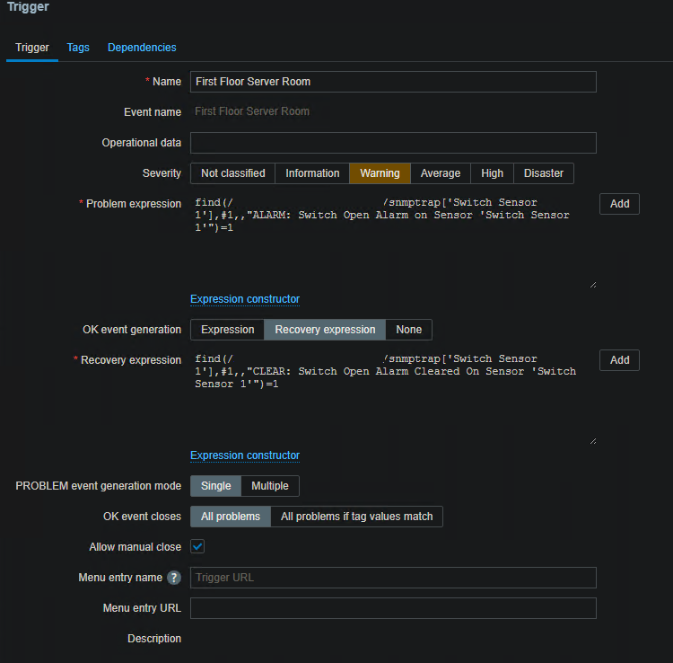 Recovery expression: find(/nameofhost/snmptrap['Switch Sensor 1'],#1,,"CLEAR: Switch Open Alarm Cleared On Sensor 'Switch Sensor 1'")=1