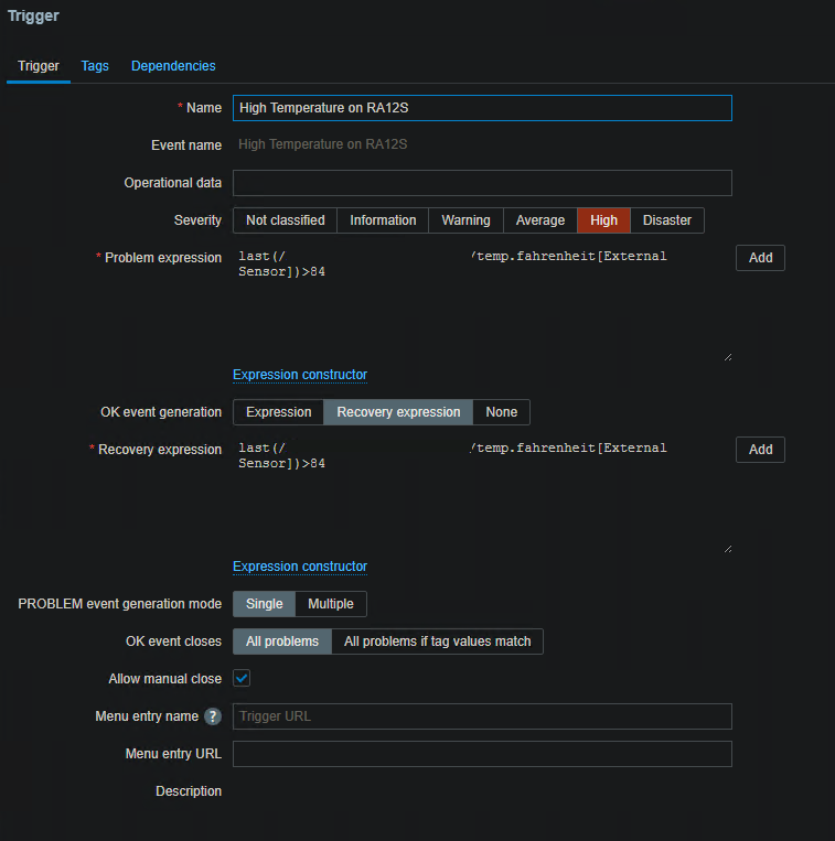 I'm not entirely sure how our existing Zabbix dashboard was initially set up, but the reason for using recovery expressions is related to its configuration. When the door sensor is in an open state, it appears under Door Activity and Problems. Once we update and acknowledge the door activity, it is immediately cleared from the problems. However, if I remove the recovery expression and we update and acknowledge the door activity, it remains in the problems for 15-45 seconds before disappearing.