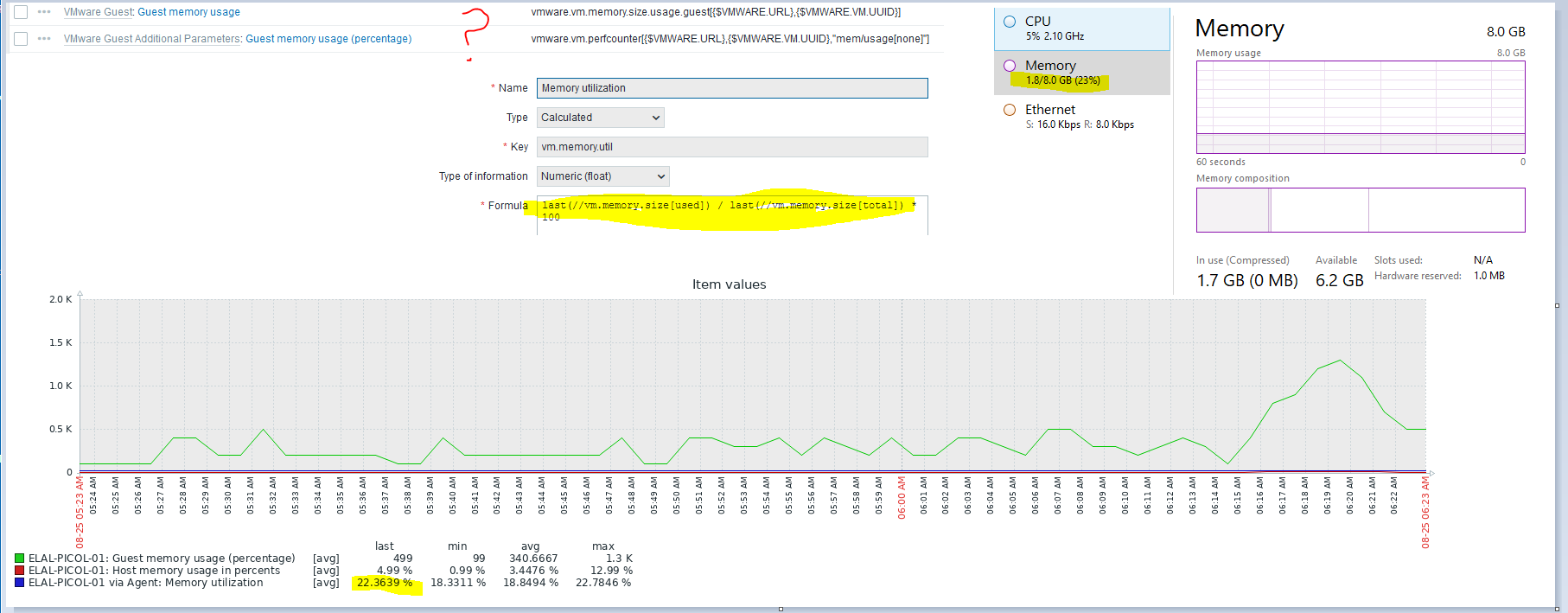 Question: Which key I need to use to collect true memory usage from guest VM? I mean the value which is shown in Task Manager. Or I need to use calculation as it is done in Zabbix Agent "memory utilization" item?