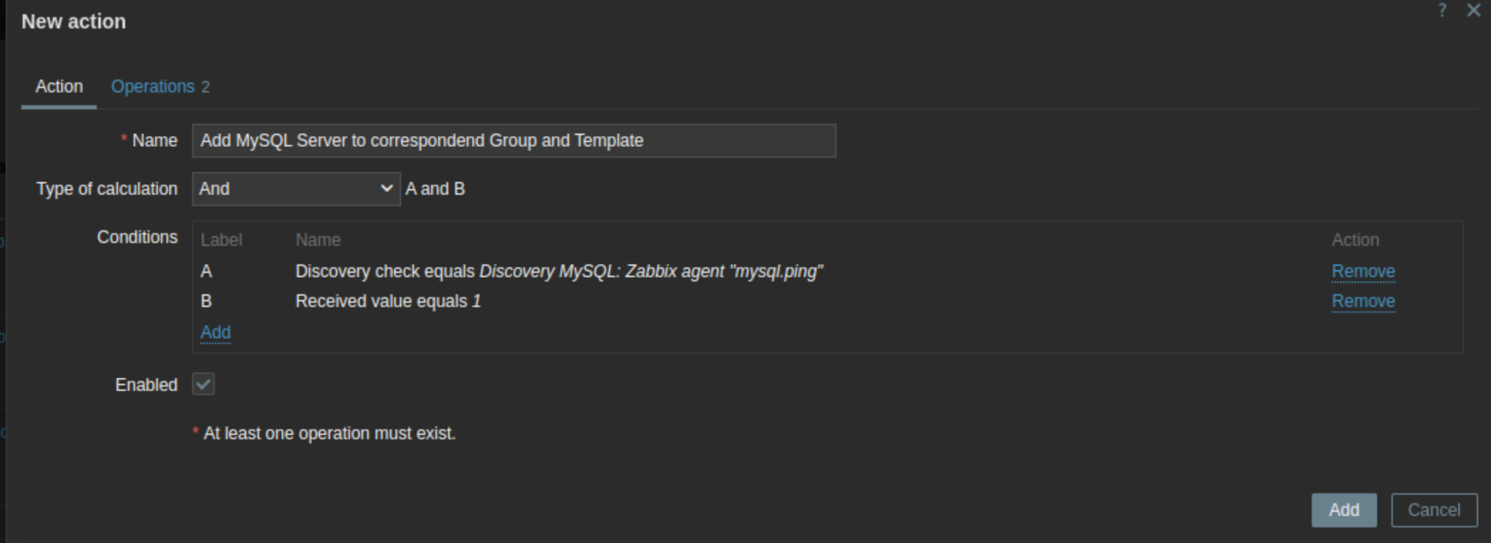 After taht I set up a Discovery Action where the condition is set that when the check mysql.ping get's a value 1, it should put it in a correspondent Group and Link it to the correspondent Template. See also the Screenshots.